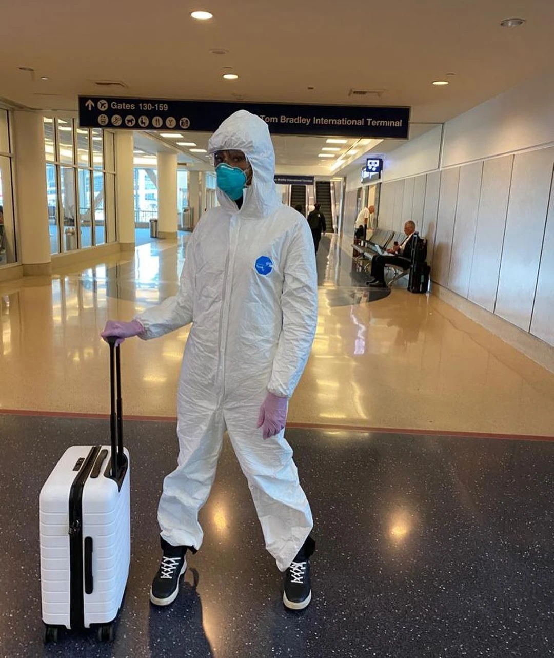 La ex supermodelo fue tendencia en redes sociales por usar un traje aislante para trasladarse de aeropuerto en aeropuerto. "La seguridad, primero", sentenció, ante la amenaza de la pandemia.