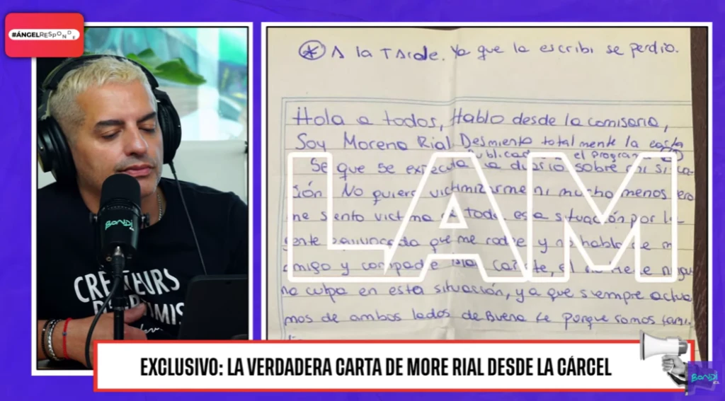 Horas después, Ángel de Brito leyó otra carta. "La carta de More Rial desde prisión, es de puño y letra. Muchos dijeron 'la tengo', pues no. Y ¿saben por qué no la tenían? No la tenían porque la carta había quedado en las pertenencias de uno de los detenidos. Así que no la podían tener", comenzó afirmando Ángel De Brito en Bondi.