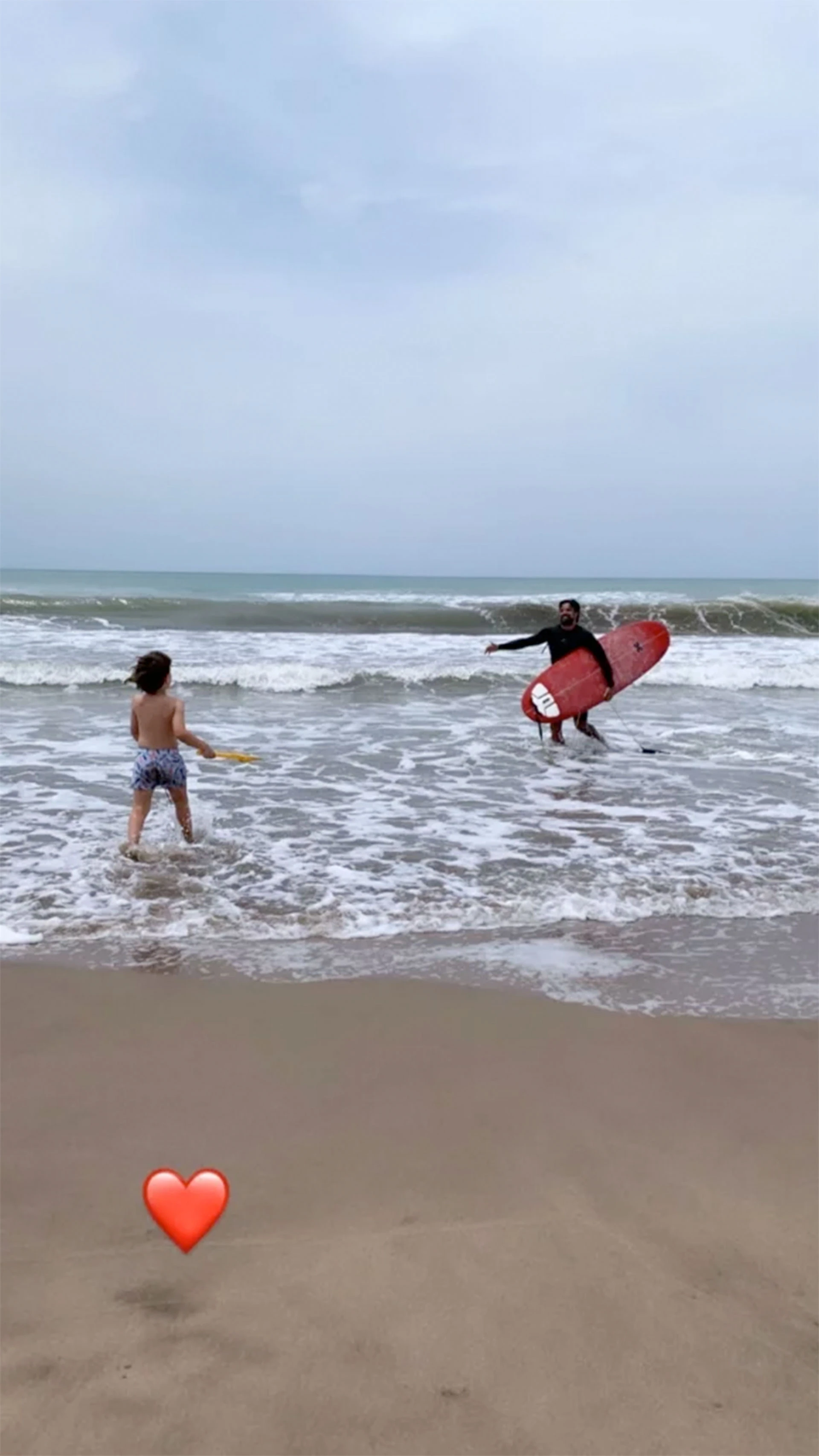 En esa jornada playera, Sabrina también filmó a Luciano, con la tabla de surf debajo del brazo, jugando en el mar con el pequeño.