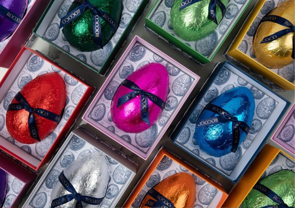 La chocolatería londinense ha ganado muchos premios por la calidad de sus productos. El chocolate está hecho a mano en su cocina. La gama de Pascua de Rococó es siempre tentadora, más aún este año con cinco nuevos huevos fabulosos, incluido el de chocolate rubí dulce y frutado, mezclado con trozos de galletas de manteca desmenuzables. Escondidas en su interior hay frambuesas envueltas en chocolate rubí.