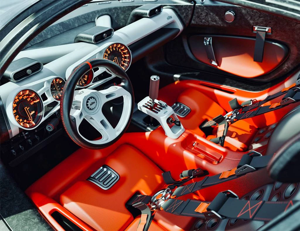 La interfaz del NILU es puramente analógica. El único elemento digital es una cámara de visión trasera que soluciona la visibilidad limitada característica de los autos deportivos con motor central. El volante compacto y redondo ofrece una precisión detallada en la dirección, sin botones ni interruptores que distraigan al conductor. La transmisión manual de siete velocidades y otros ajustes, como el volante y los espejos, se controlan manualmente, brindando una experiencia de conducción inmersiva y sin distracciones.