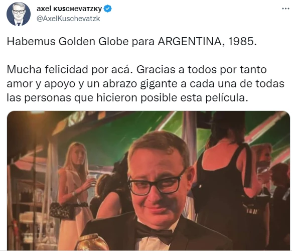 Por su parte, Axel Kuschevatzky, productor del film, no pudo contener la emoción y se expresó en Twitter: "Habemus Golden Globe para ARGENTINA, 1985. Mucha felicidad por acá. Gracias a todos por tanto amor y apoyo y un abrazo gigante a cada una de todas las personas que hicieron posible esta película".