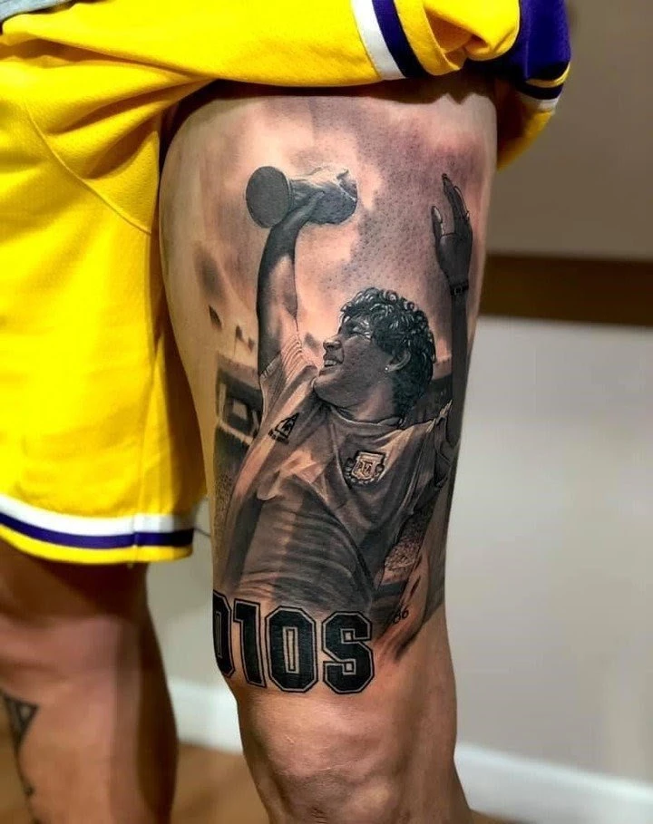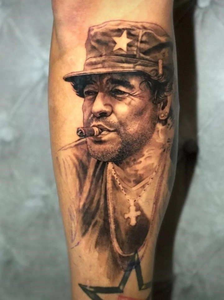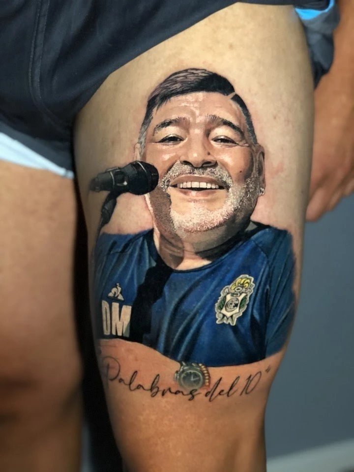 En estos días le hizo un "Maradona" a Marcos Rojo. El defensor argentino, que milita en el Manchester de Inglaterra, le pidió que se lo haga en su pierna derecha. En su caso eligió uno de la época del Diez post Cuba, con el habano en la boca y una gorra que le había regalado Fidel Castro.