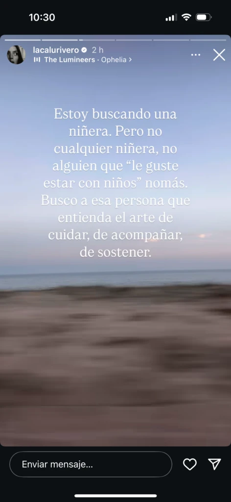 "¿Dónde están? ¿Dónde se han ido? ¿Siguen existiendo o es que me perdí de algo? ¿Es un oficio en extinción?", comenzó preguntando. Luego añadió: "Estoy buscando una niñera. Pero no cualquier niñera, no alguien 'que le guste estar con los niños' no más. Busco a esa persona que entienda el arte de cuidar, de acompañar, de sostener".
