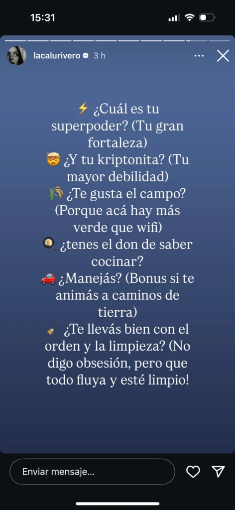 Después preguntó: "¿Cuál es tu kriptonita? (Tu mayor debilidad). ¿Te gusta el campo? (porque acá hay más verde que wifi). ¿Tenés el don de saber cocinar? ¿Manejás? (Bonus si te animás a caminos de tierra). ¿Te llevás bien con el orden y la limpieza? (No digo obsesión, pero que todo fluya y esté limpio).