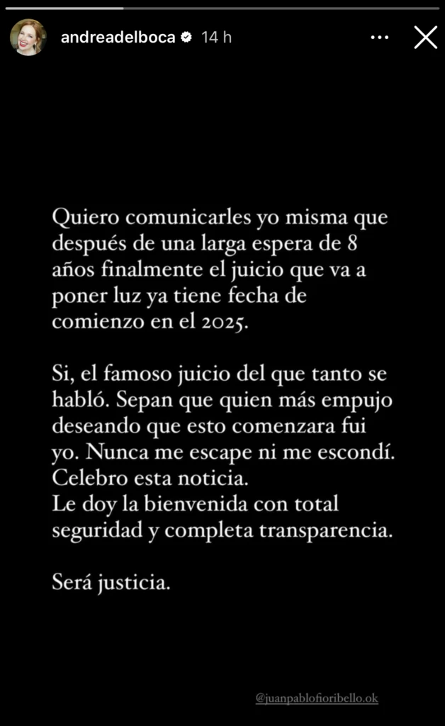 "Quiero comunicarles yo misma que después de una larga espera de 8 años, finalmente el juicio que va a poner luz ya tiene fecha de comienzo en el 2025", comenzó anunciando Andrea. Entonces, afirmó: "Sí, el famoso juicio del que tanto se habló".