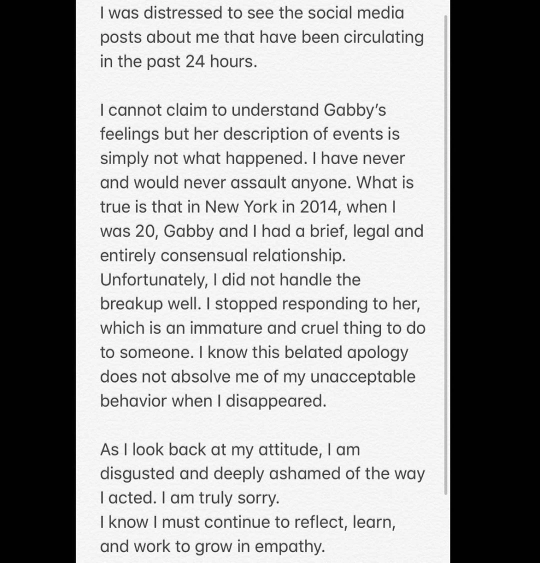 "He estado muy angustiado viendo las publicaciones sobre mí que han estado circulando en las redes sociales en las últimas 24 horas. No puedo negar que entiendo los sentimientos de Gabby, pero su descripción de los hechos no es simplemente cómo ocurrió. Nunca he abusado y nunca abusaría de nadie. Lo que es verdad es que en Nueva York en 2014, cuando yo tenía 20 años, Gabby y yo tuvimos una relación breve, legal y enteramente consensuada. Desafortunadamente, no gestioné la ruptura demasiado bien. Dejé de contestarle los mensajes, lo cual es algo cruel e inmaduro. Ya sé que esta disculpa tardía no me absuelve de comportamiento inaceptable cuando desaparecí. Cuando pienso en mi comportamiento en el pasado, me da asco y me siento profundamente avergonzado de la manera que actué. Lo siento de verdad. Sé que debo continuar reflexionando, aprendiendo y trabajando para ganar en empatía".
