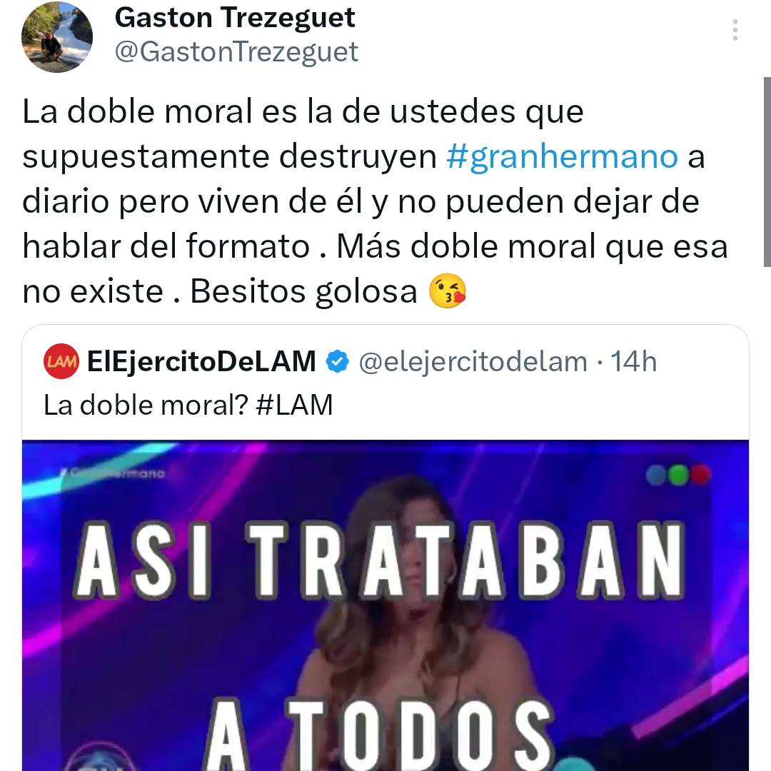En la cuenta oficial del Ejército de LAM en la red social X, postearon un video donde muestran cómo el analista de GH fue bastante severo con cada participante que fue saliendo del programa, y lo tildaron de tener doble moral porque, en el caso de Furia, se ignoraron todos sus fuertes comportamientos y dichos contra sus compañeros.