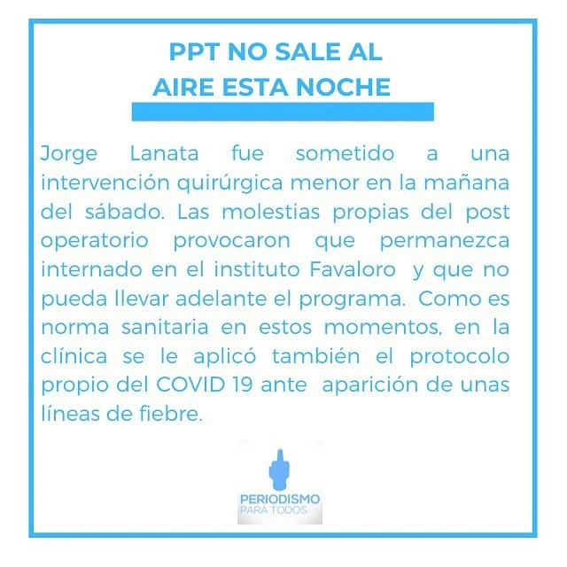 Si bien se trató de una cirugía de bajo riesgo, el periodista tuvo fiebre y por eso debió someterse a un hisopado de Covid-19, según informaron fuentes cercanas. Asimismo, confirmaron que la suspensión del programa se debe a que, por "molestias propias del post-operatorio" Lanata debe permanecer internado.