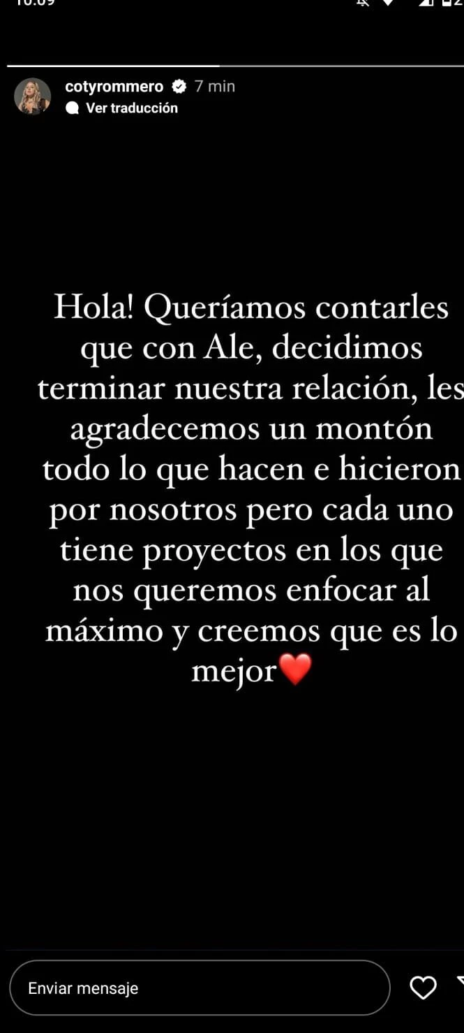 En el mensaje, la joven siguió agradeciendo a sus seguidores por "la buena onda" que le enviaron a la pareja durante su tiempo juntos. “Les agradecemos un montón todo lo que hacen e hicieron por nosotros”. Y cerró: “Cada uno tiene proyectos en los que nos queremos enfocar al máximo y creemos que es lo mejor”.