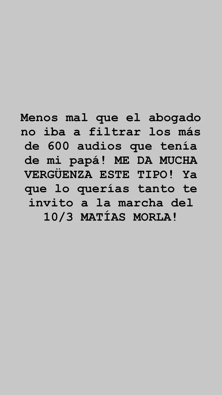 Recientemente, Dalma usó nuevamente su cuenta de Instragram para volver a defenestrar a Matías Morla y compañía: “¡Menos mal que el abogado no iba a filtrar los más de 600 audios que tenía de mi papá! Me da mucha vergüenza este tipo”.