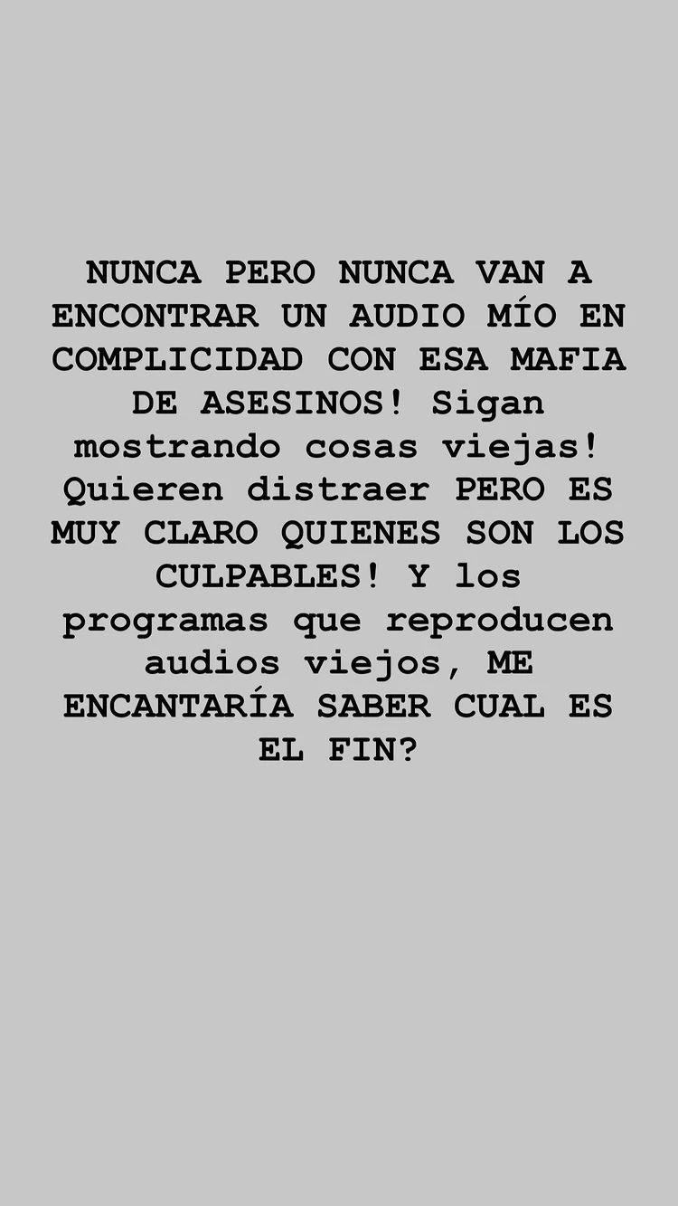 “¡Nunca, pero nunca van a encontrar un audio mío en complicidad con esa mafia de asesinos! ¡Sigan mostrando cosas viejas! Quieren distraer, pero es muy claro quiénes son los culpables”, soltó la mayor de las hijas de Diego.
