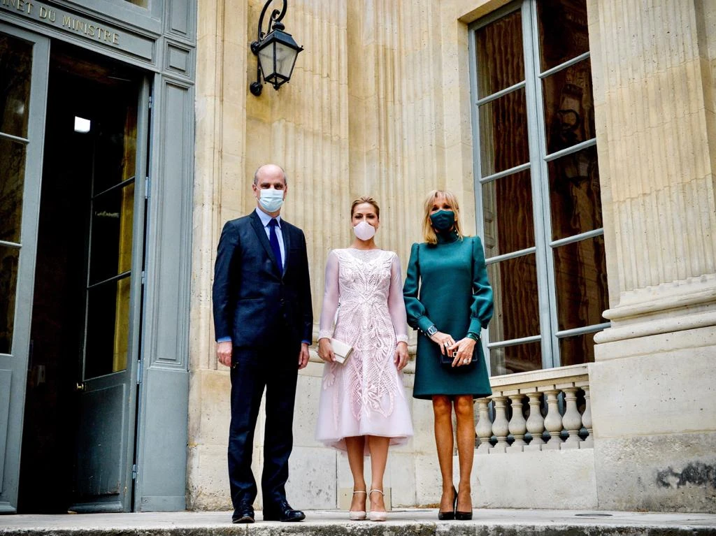 Yánez lució un vestido de mangas largas en rosa empolvado, completamente bordado y con sutiles transparencias, que complementó con barbijo al tono y zapatos y sobre en color nude. Por su parte, Macron optó por el verde, uno de sus colores favoritos, en un diseño de cuello base por arriba de las rodillas y con mangas abullonadas que son tendencia.