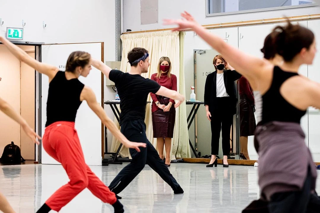Demostrándolo, fue al ensayo general de una compañía de danza internacional contemporánea con base en La Haya (el Nederlands Dans Theater) con una falda tubo granate de lino encerado, de Natan, una empresa de origen belga.