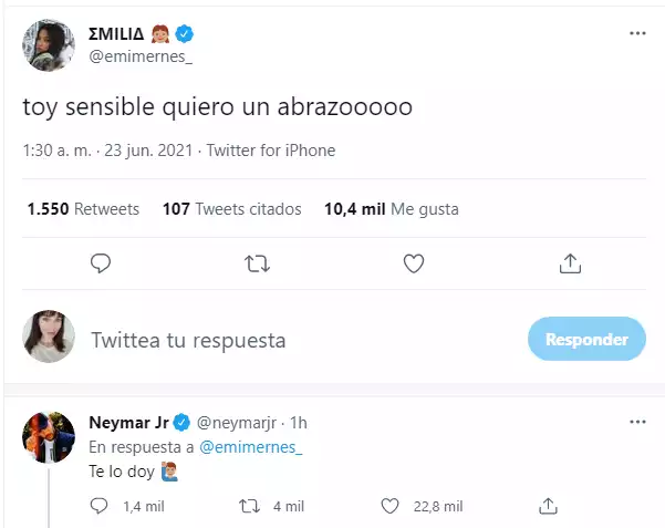 Pasa que la famosa cantante Emilia Mernes hace varias horas publicó: "Toy sensible quiero un abrazooooo". En medio de la concentración de la Copa América en Brasil, Neymar se tomó unos minutos y le respondió a Mernes: "Te lo doy".