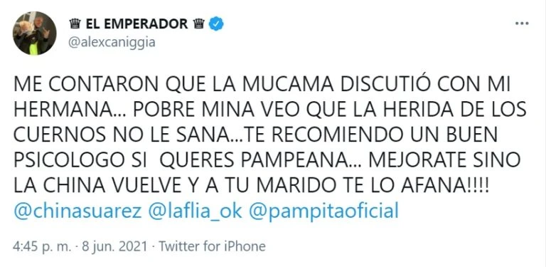 Para cerrar el tuit, Alexander, también conocido como El Emperador, había sido lapidario: "Te recomiendo un buen psicólogo, si querés pampeana. Mejorate, sino la China vuelve y a tu marido te lo afana".