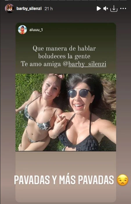 "Qué manera de hablar boludeces la gente. Te amo amiga", escribió la psicóloga arrobando a Barby, quien se hizo eco de la publicación y al replicarla en su cuenta agregó: "Pavadas y más pavadas".