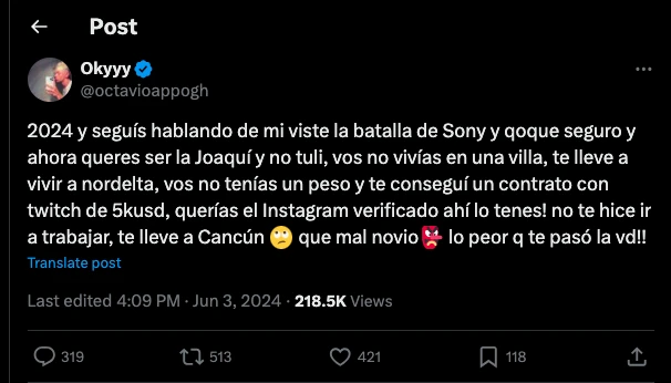 Uno de los comentarios por los que más comentarios negativos se llevó Oky vía Twitter fue por menospreciar no sólo el caso de violencia de Tuli, sino el de su colega, La Joaqui. "2024 y seguís hablando de mi. Viste la batalla de Sony y Coque seguro y ahora queres ser la Joaqui. Y no Tuli, vos no vivías en una villa, te lleve a vivir a Nordelta, vos no tenías un peso y te conseguí un contrato con Twitch de 5k usd. Querías el Instagram verificado ¡ahí lo tenes! No te hice ir a trabajar, te lleve a Cancún 🙄 que mal novio👺 lo peor q te pasó la vedad!!", argumentó el muchacho.