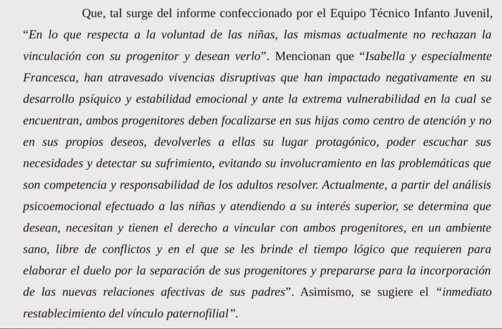 "Ante la extrema vulnerabilidad en la cual se encuentran, ambos progenitores deben focalizarse en sus hijas como centro de atención y no en sus propios deseos, devolverles a ellas su lugar protagónico, poder escuchar sus necesidades y detectar su sufrimiento, evitando su involucramiento en las problemáticas que son competencia y responsabilidad de los adultos resolver", se puede leer en otro párrafo del mencionado documento.