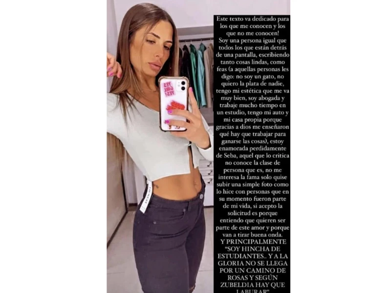 En ese sentido, remarcó su amor por el ídolo de Estudiantes de La Plata y se autodefinió como fanática del fútbol. "Estoy perdidamente enamorada de Seba. Aquel que lo critica no conoce la clase de persona que es. No me interesa la fama, solo quise subir una simple foto como lo hice con personas que en su momento fueron parte de mi vida...".