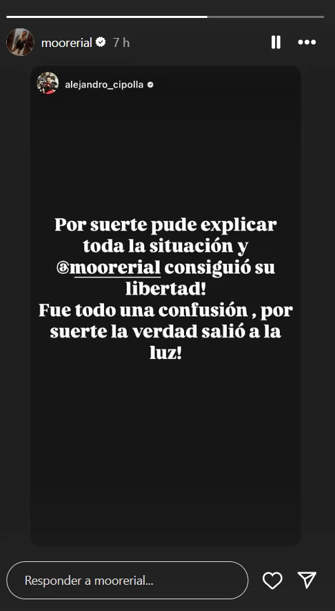 "¡Por suerte pude explicar toda la situación y @moorerial consiguió su libertad!", fueron las primeras palabras que Alejandro Cipolla, el abogado de Morena, expresó en sus historias de Instagram sobre una placa negra con letras blancas. Y añadió: "¡Fue todo una confusión! Por suerte la verdad salió a la luz".
