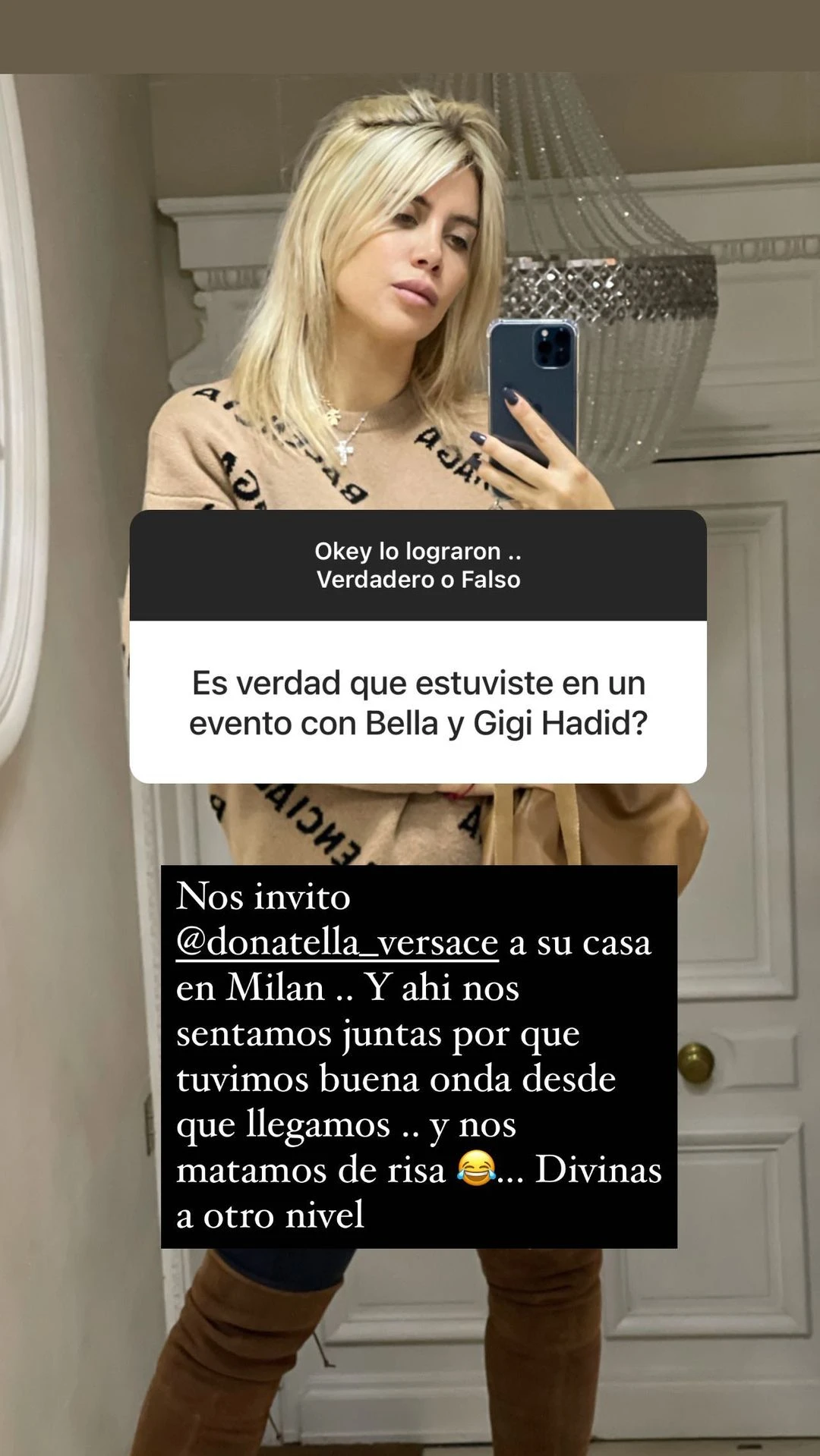 Eso le dio pie a Wanda para contar que las conoció en una comida, en la casa de Donatella Versace. "Nos invitó a su casa en Milán. Nos sentamos juntas porque tuvimos buena onda desde que llegamos". Pero no se quedó ahí: "Nos matamos de la risa... Divinas a otro nivel", remató.