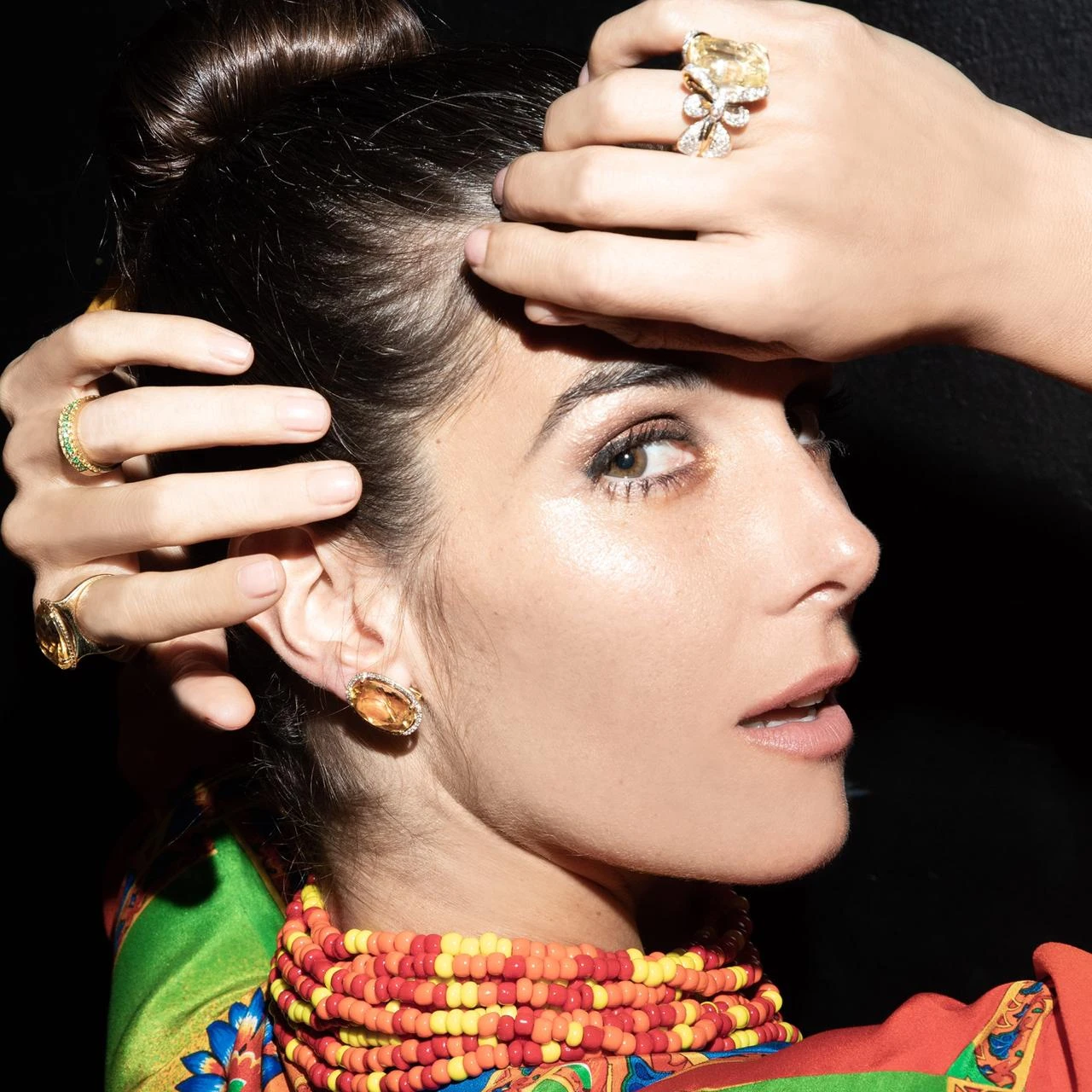 Y este mediodía, en Almorzando con Mirtha Legrand, fue por más y apostó a un vestido de creap de jean de seda natural estampado de línea suelta con mangas en gasa degradé, que acompañó con joyas de Jean Pierre: unos aros oval con citrinos y brillantes, muchas pulseras esclavas multicolor con esmeraldas, brillantes y zafiros amarillos y rosas, un anillo central citrino, y sinfines de esmeraldas y zafiros amarillos.