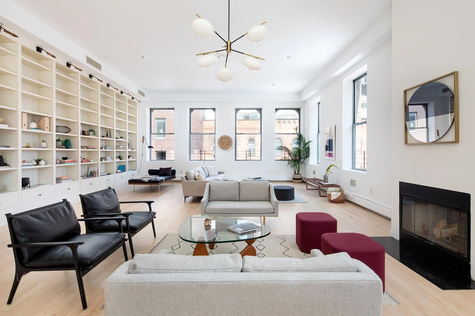 En el living se destaca una enorme estantería de techo a suelo, varias ventanas, suelo de madera y una chimena minimalista.