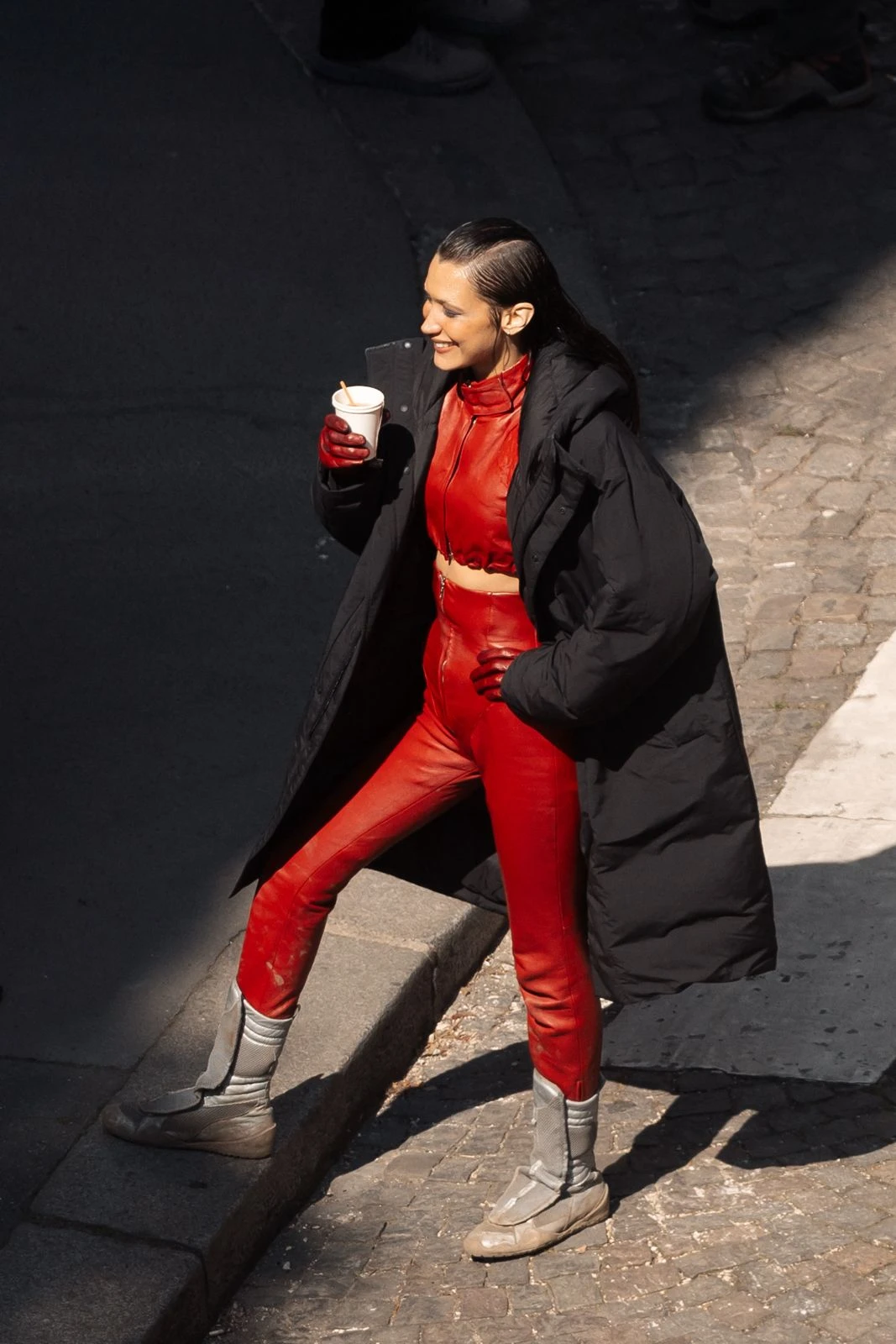 Otra reconocida fashionista que marca tendencia con cada look con el que aparece en público es la modelo estadounidense Bella Hadid. También desde la capital francesa, la figura de 28 años impactó con un sexy catsuit de dos piezas al cuerpo, que complementó con unos guantes a tono y el tapado puffer en tendencia en color negro para contrastar a la perfección.