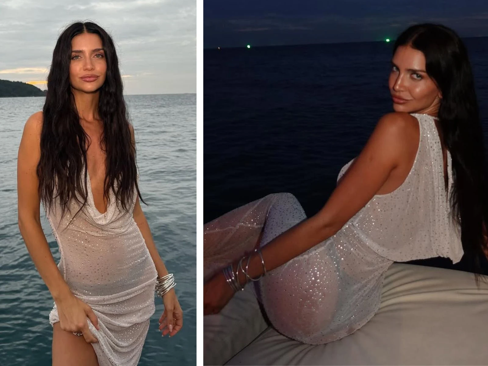 En cuanto a Zaira Nara, la modelo que ya se encuentra en Punta del Este, viene derrochando glamour en clave playero. Tal y como se puede apreciar en la foto, se decantó por un clásico minidress de lentejuelas plateadas con escote también en V, que complementó con una campera de animal print, un trend indiscutido de la temporada, unas botas caña alta y un sombrero de estilo cowboy a tono, y