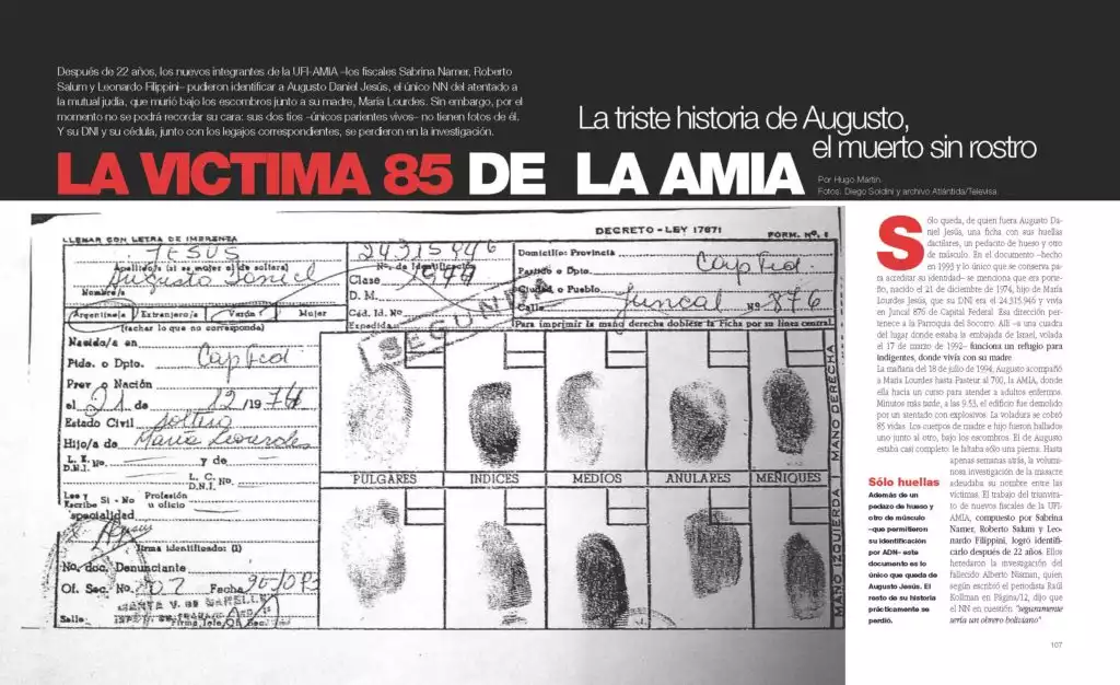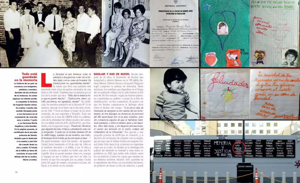 La nota de GENTE sobre la confirmación de la identidad del ultimo muerto del atentado a la AMIA -que fue la edición 2670, publicada el 20 de septiembre de 2016-, finalizaba con un ruego del periodista que la escribió: “Puede ser, entonces, que alguien lea esta crónica y desempolve una vieja fotografía. Y ojalá así, la víctima numero 85 de la AMIA tenga, además de un nombre, un rostro. El mensaje en la botella ya fue arrojado al mar…”.
