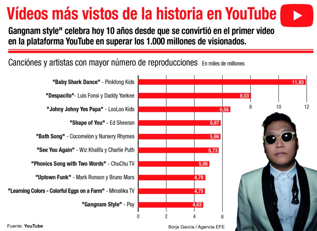 'Gangnam style', el popular tema del rapero surcoreano Psy, celebra hoy 10 años desde que se convirtió en el primer vídeo en la plataforma YouTube en superar los 1.000 millones de visionados.