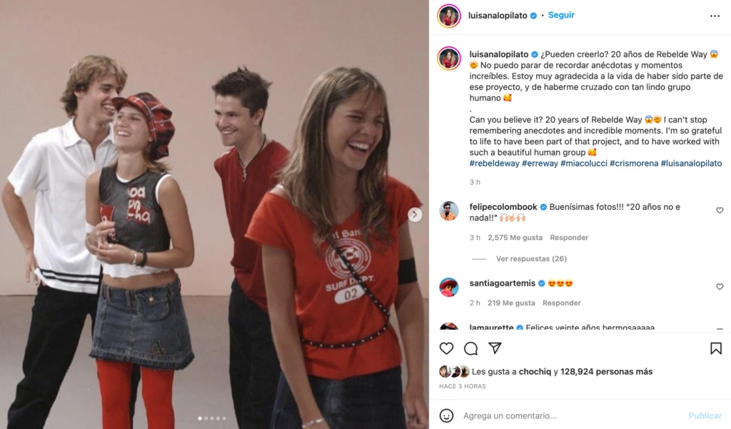 Una de sus protagonistas que recordó hoy el programa fue Luisana Lopilato, la actriz realizó un emotivo posteo en las redes sociales recordando a todos sus compañeros de elenco. "¿Pueden creerlo? 20 años de Rebelde Way. No puedo parar de recordar anécdotas y momentos increíbles. Estoy muy agradecida a la vida de haber sido parte de ese proyecto, y de haberme cruzado con tan lindo grupo humano", expresó la actriz junto a un carrusel de fotos inéditas.