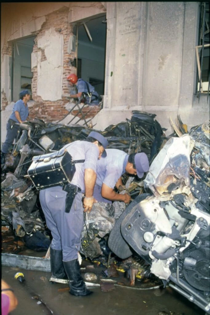 "Aquel 17 de marzo estábamos entrevistando al ex coronel Juan Cesio: había una doble página para completar el cierre y la nota tenía ese destino", rememora la periodista María José Grillo. "Hasta que se produjo el estruendo y nos fuimos corriendo las cuatro cuadras que nos separaban del lugar –continúa–. En el camino nos cruzábamos con gente ensangrentada, incluso chicos de un jardín de infantes cercano, que huían de la explosión. Me metí por la vidriera rota de un banco y pedí un teléfono para llamar a la redacción. Marqué y no dudé: 'Manden a todo el equipo. No sé qué pasó, pero es muy grave'", pidió. El equipo de GENTE, con Grillo y Oscar Mosteirín fue el primero en llegar y se encontró con un paisaje desolador.