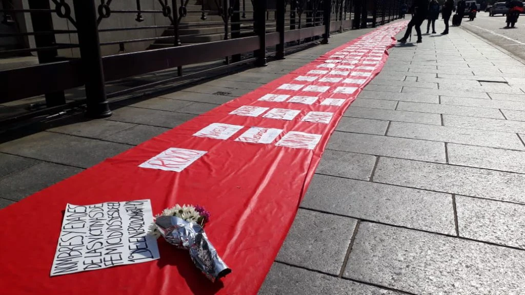 Las periodistas, con barbijos con la inscripción de Ni una menos, pegaron en una enorme bandera roja colgada en las rejas del Congreso los nombres de todas las víctimas de la violencia machista desde el 1 de enero del 2020 hasta hoy.