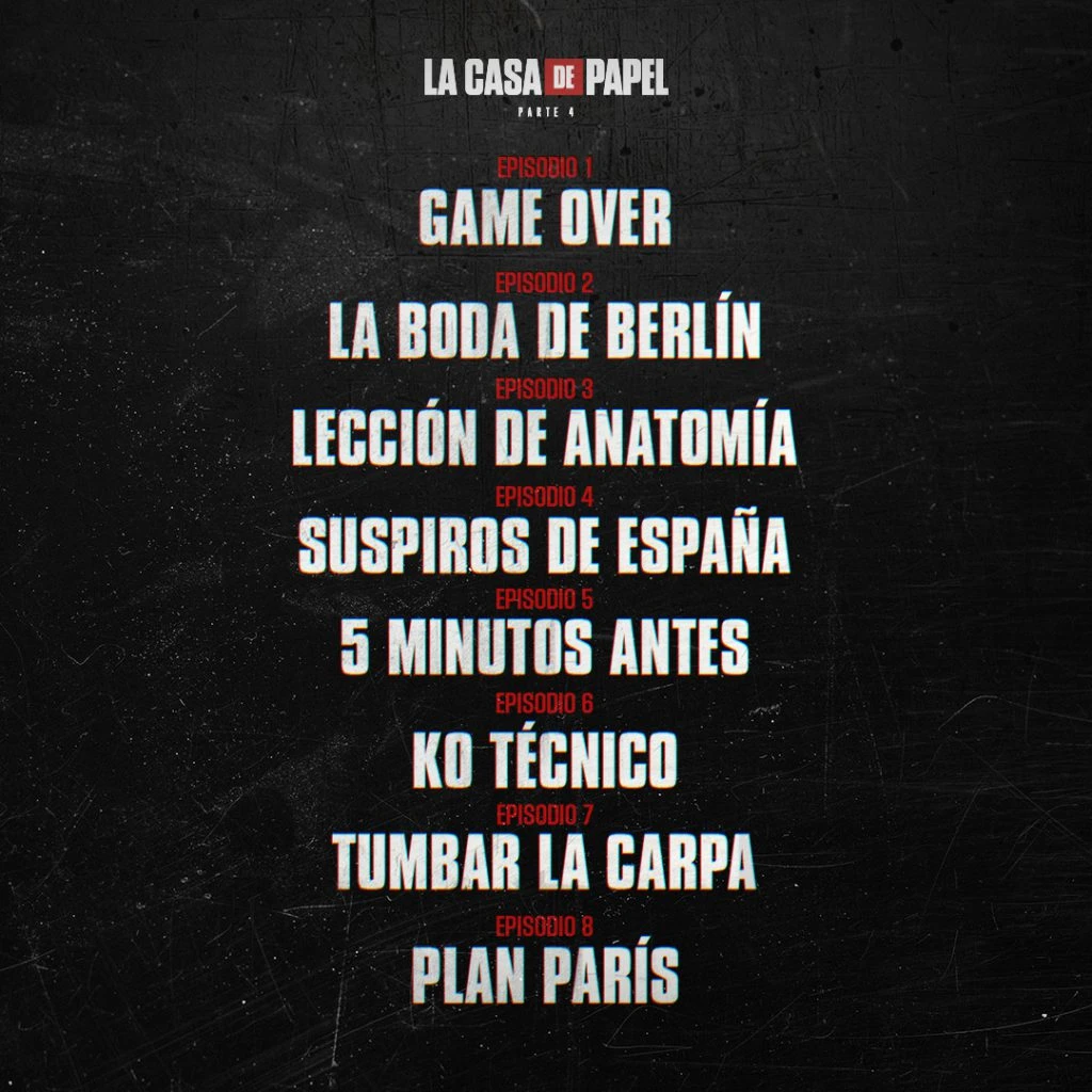 A solo dos días del estreno de la cuarta temporada de La Casa de Papel, Netflix reveló los 8 títulos de los episodios de la nueva entrega.