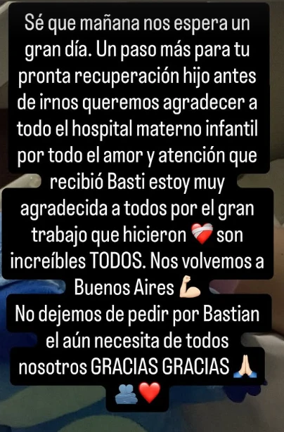 Horas antes del traslado, su mamá, Macarena, compartió un mensaje cargado de emoción y agradecimiento. “Sé que mañana nos espera un gran día. Un paso más para tu pronta recuperación hijo antes de irnos queremos agradecer a todo el hospital materno infantil por todo el amor y atención que recibió Basti estoy muy agradecida a todos por el gran trabajo que hicieron️️, son increíbles TODOS. Nos volvemos a Buenos Aires... No dejemos de pedir por Bastián el aún necesita de todos nosotros GRACIAS GRACIAS”, expresó.