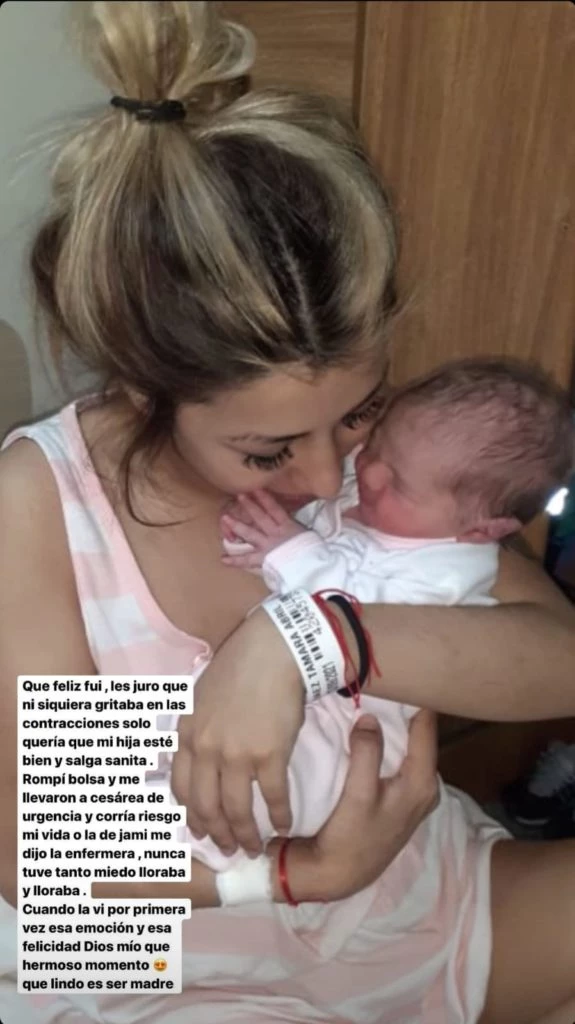 Con una foto de la niña a horas de haber nacido escribió en una historia de Instagram, "Que feliz fui, les juro que ni siquiera gritaba en las contraccionessolo quería que mi hija esté bien y salga sanita. Rompí bolsa y me llevaron a cesárea de urgencia y corría riesgo mi vida o la de Jami, me dijo la enfermera".