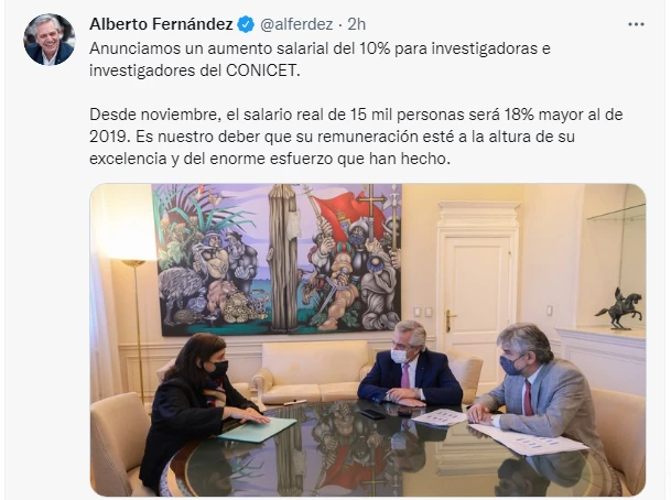 El presidente Alberto Fernández publicó luego del encuentro un mensaje en su cuenta de la red social Twitter donde dijo: "Anunciamos un aumento salarial del 10% para investigadoras e investigadores del Conicet. Desde noviembre, el salario real de 15 mil personas será 18% mayor al de 2019".