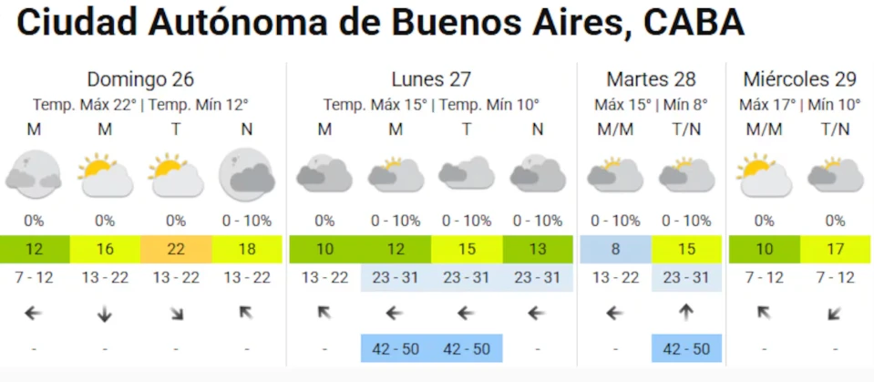 En tanto, el martes 28 será el día más frío de la semana. La sensación térmica podría caer hasta 1° en localidades como Olavarría, mientras que en la Ciudad de Buenos Aires la mínima se ubicará en 7°. El cielo permanecerá mayormente nublado, con una máxima de 16° por la tarde.