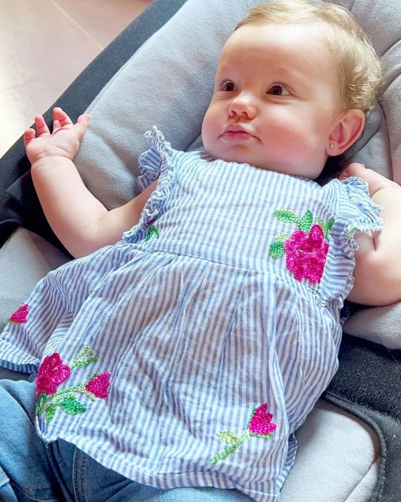 Anita posee un perfil con más de 200 mil seguidores y en él, Pampita compartió una serie de imágenes donde la beba se muestra risueña y carismática con su mini look: blusa celeste con rayas verticales blancas, bordados de flores en color rosa y volados en las mangas y pantalón de jean achupinado en color azul.