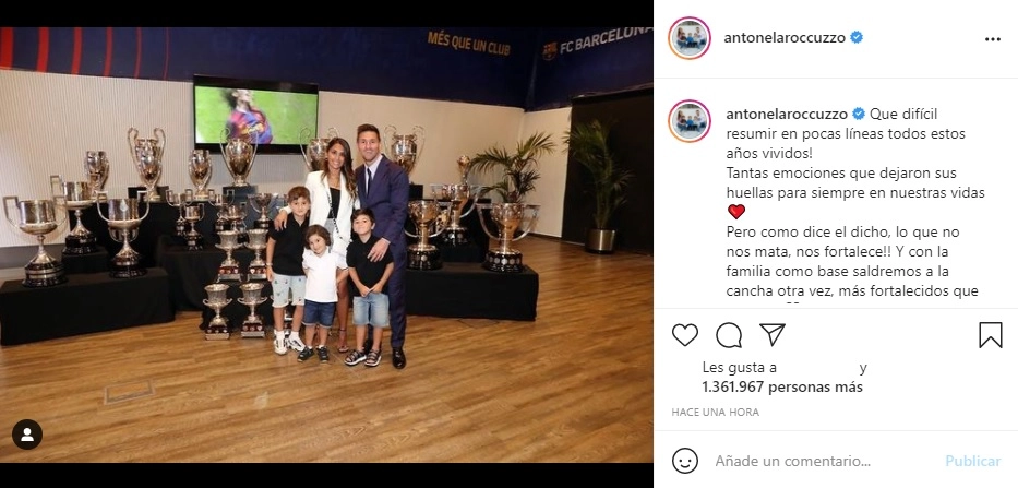 Además junto a una postal donde se la ve con el futbolista y sus hijos, Thiago, Mateo y Ciro, rodeados de los innumerables trofeos que ganó Leo en el Barça escribió: "Pero como dice el dicho... lo que no nos mata, nos fortalece. Y con la familia como base saldremos a la cancha otra vez, más fortalecidos que nunca… Vamos juntos hacia donde sea, pero siempre hacia adelante". Y concluyó enamorada: "¡¡¡Te amo mi amor!!!".