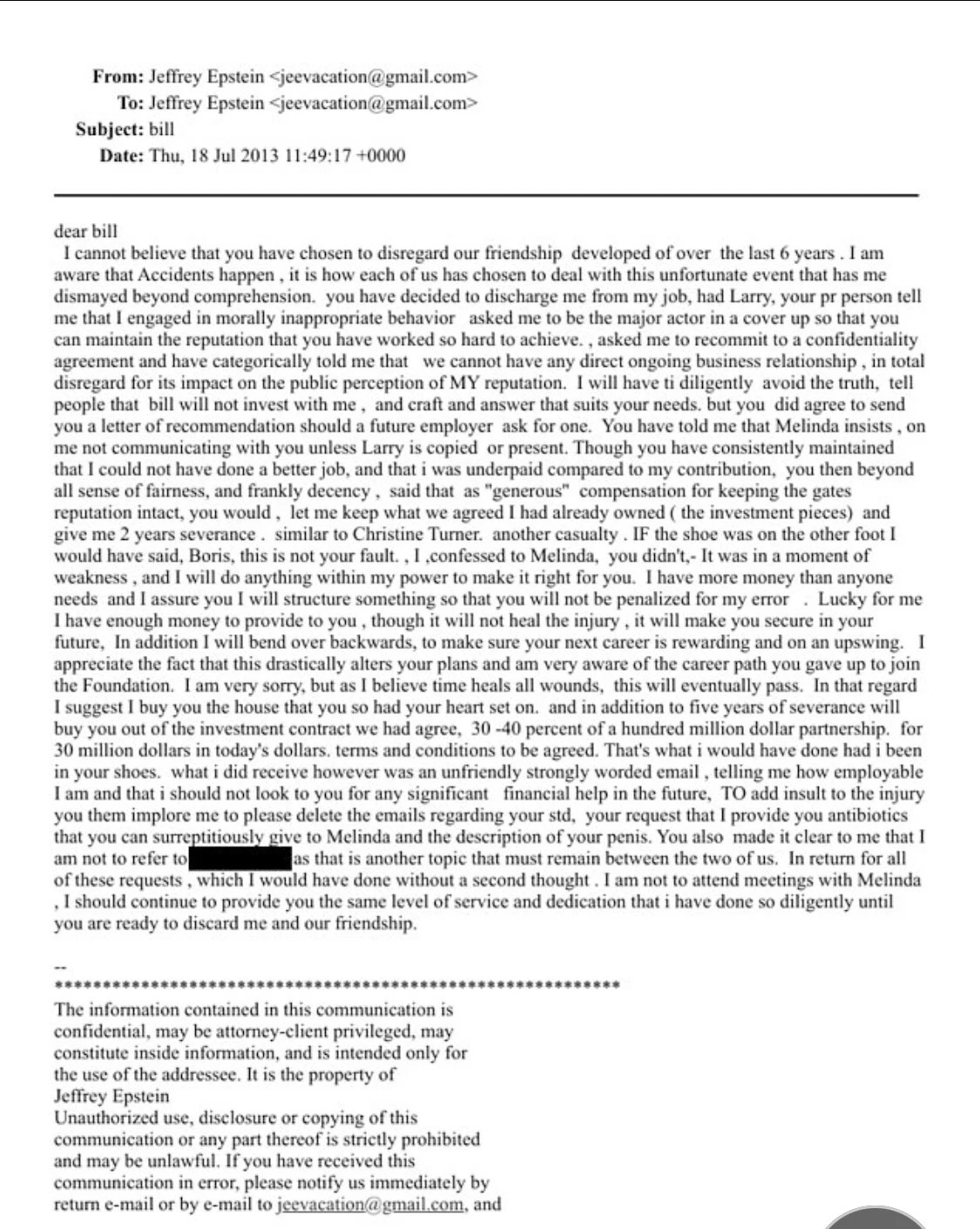 En un mensaje que empieza con un "querido Bill", el magnate lo acusa de querer esconder una enfermedad de transmisión sexual incluso de su mujer Melinda. El portavoz de Gates aseguró que se trata de afirmaciones "absolutamente absurdas y completamente falsas" de un tipo que estaba desesperado por difamarlo. Según explicó, no hacen más que reflejar la frustración de Epstein por no poder mantener un vínculo con él.