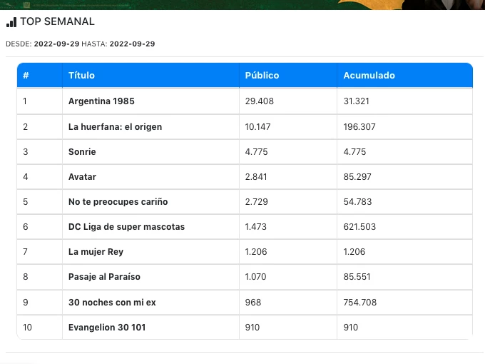 Desde hace semanas que Argentina, 1985 viene haciendo ruido. Primero, por la ovación de 9 minutos que recibió en el Festival de Venecia, tras su proyección, después, por los premios que ganó en el Festival de San Sebastián, y, hace unos días, por ser el film elegido por la Academia de cine argentino para que represente al país en los Premios Oscar 2023. Con tantas noticias a su alrededor, el film, dirigido por Santiago Mitre y protagonizado por Ricardo Darín y Peter Lanzani, fue acompañado por el público. Según reportó Ultracine, en el día de su estreno, un total de 29.408 espectadores fueron a ver la película que recrea el juicio a las juntas militares. Algo que fue corroborado por la consultora Comscore-IBOE, que tuvo registros similares sobre audiencia.