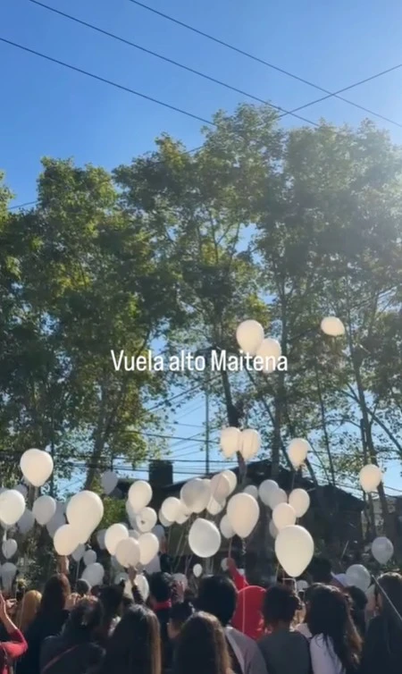 La convocatoria se dio en medio de la conmoción que atraviesa Merlo desde que se conoció la muerte de la adolescente, y terminó convirtiéndose en una ceremonia espontánea: globos blancos al cielo, aplausos, lágrimas y un grito que atravesó el aire como un rezo laico: “Maitena presente”. Ese gesto —tan habitual en despedidas escolares— tuvo esta vez una potencia distinta: no fue un acto institucional programado con mucha anticipación, sino una necesidad urgente de despedirse donde la vida cotidiana había quedado interrumpida.