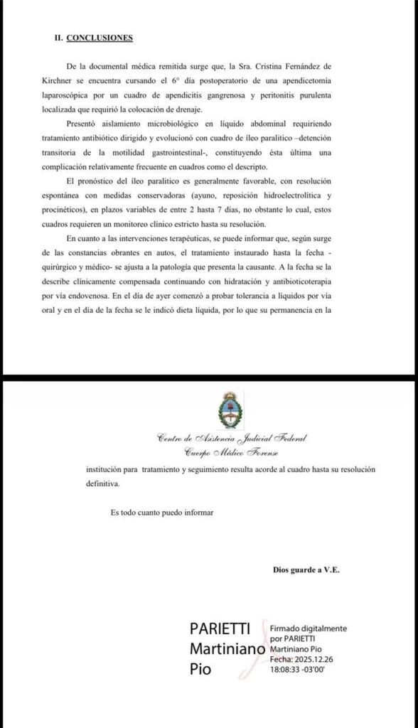 El informe, emitido este 26 de diciembre, confirma que la expresidenta se encuentra en el sexto día postoperatorio y describe su evolución como clínicamente compensada, aunque con complicaciones esperables en este tipo de cuadros.