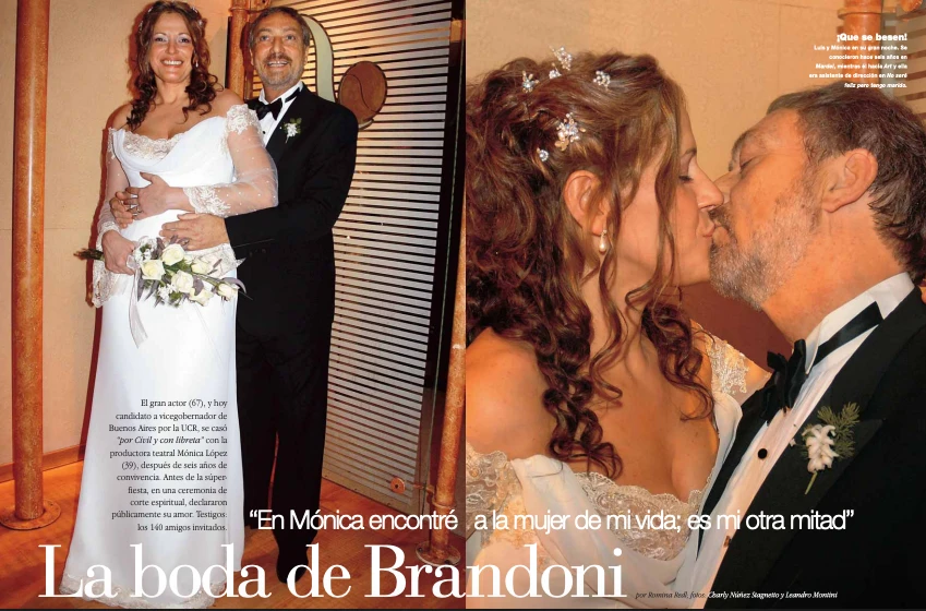 Adalberto Luis Brandoni (67 entonces) había llegado a ese Registro Civil acompañado por cuatro testigos que ya sabían todo de esa historia de amor con Mónica López (entonces de 39; 28 años menor): el empresario teatral Carlos Rottemberg –el mismo que los presentó–, Marcela López, hermana de Mónica, Victorio Garbatti y Juan Manuel Fernández. La doctora Patricia Pommier fue quien los declaró marido y mujer.