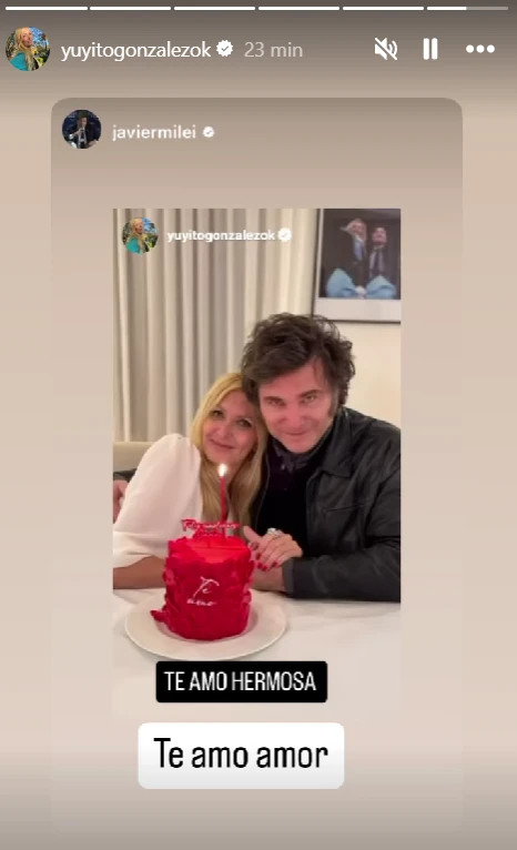 A las pocas horas de haber terminado el cumpleaños de Milei, su novia, Yuyito, compartió un posteo en su cuenta de Instagram, con algunas tiernas postales de la pareja celebrando en este día especial. Delante de ellos estaba la torta de cumpleaños, que era roja, con una velita del mismo color y un cartel que decía "Feliz cumpleaños Javier" y luego otro que agregaba: "Te amo".