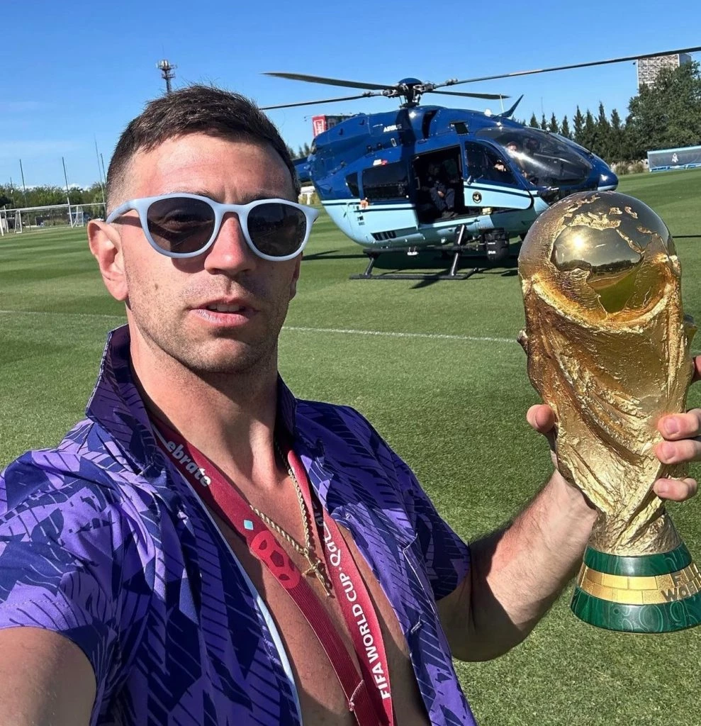 Pero las redes estallaron cuando los jugadores enseñaron como estaban arriba del helicóptero: se pudo ver a un Dibu Martinez a puro glamour subiendo con la Copa del Mundo y unos lentes oscuros con una camisa violeta a punto de abordar el helcióptero.