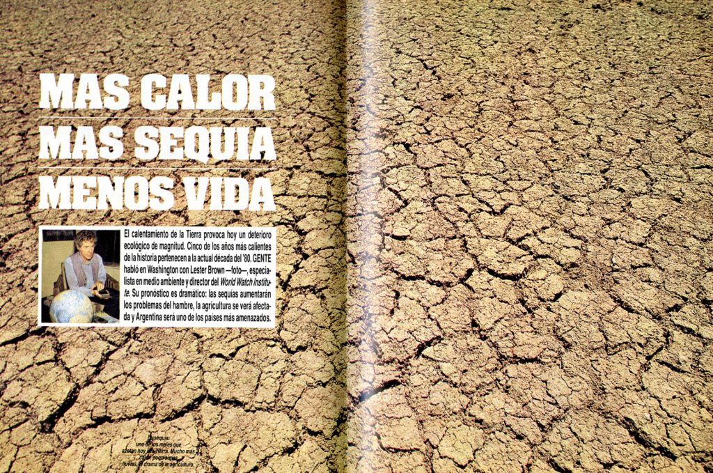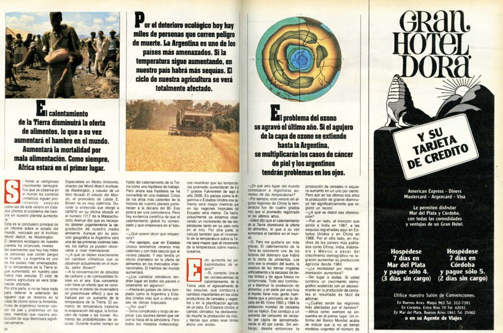 Pero la provisión de agua potable –que todavía está lejos de llegar a todas las familias del país– no era ni es en la actualidad el único problema relacionado al vital elemento. A fines de los 80' GENTE relataba el impacto del calentamiento de la Tierra y anunciaba un "pronóstico dramático": "Las sequías aumentarán los problemas del hambre, la agricultura se verá afectada y Argentina será uno de los países más amenazados". El apocalíptico artículo hacía referencia al "vertiginoso crecimiento demográfico" y daba cuenta de que los cinco años más cálidos de la Historia habían tenido lugar durante esa década. El agujero en la capa de ozono era uno de los ítems que más preocupaban a nivel ambiental.